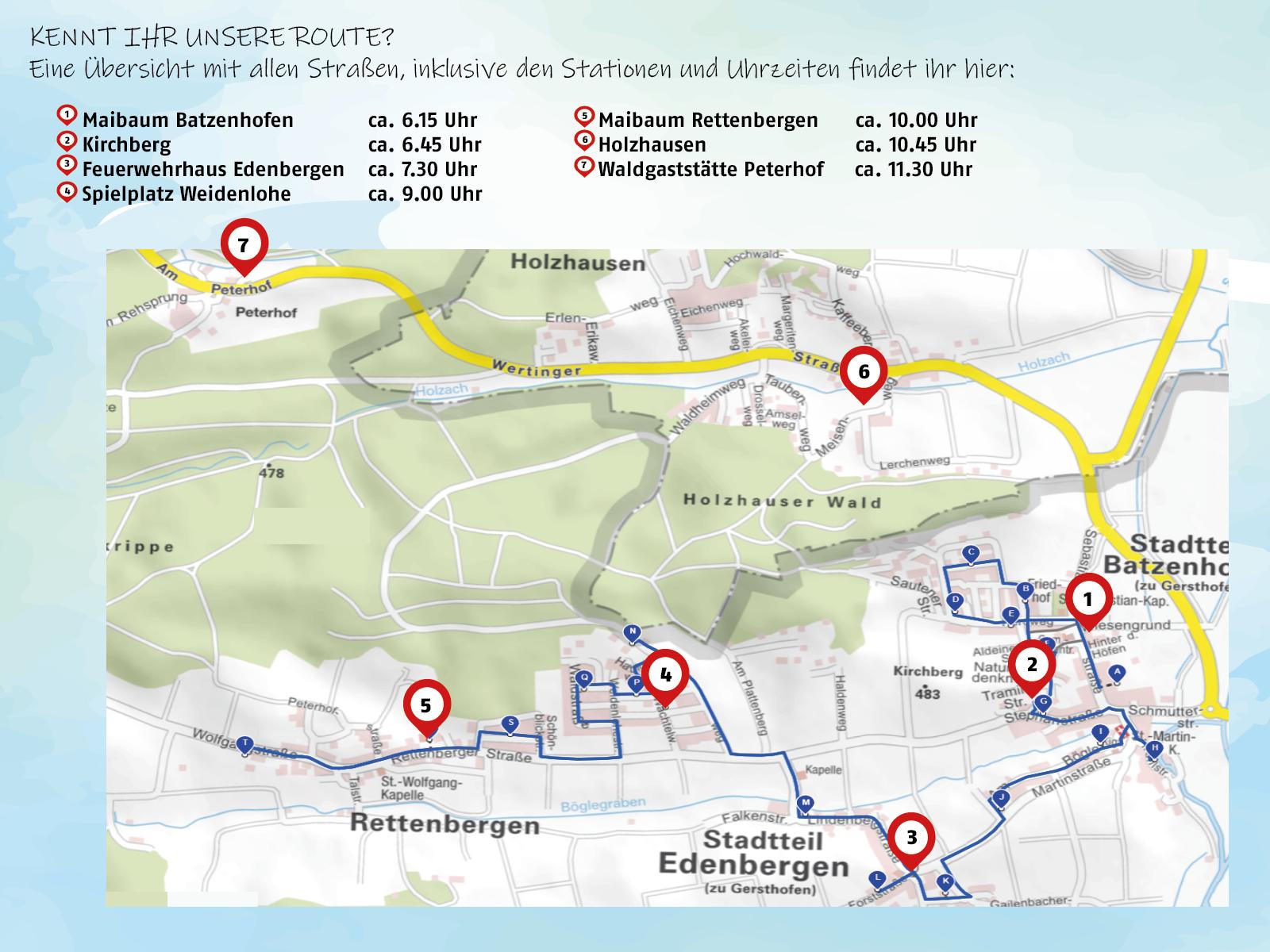 Jedes Jahr marschieren wir am 01.05. ab 6:00 Uhr durch die Orte Batzenhofen, Edenbergen, Rettenbergen, Holzhausen und Peterhof zu unserem traditionellen Weckruf.